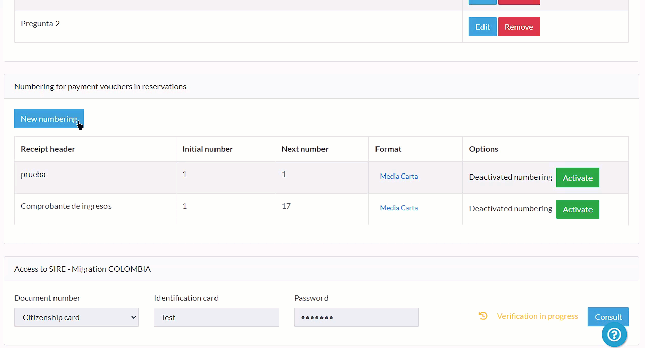 This block allows you to create different numbering, for example, for credit vouchers, income, etc, from the reservations. To make this configuration you must click on "new numbering" and then fill in the data and the format of the voucher.