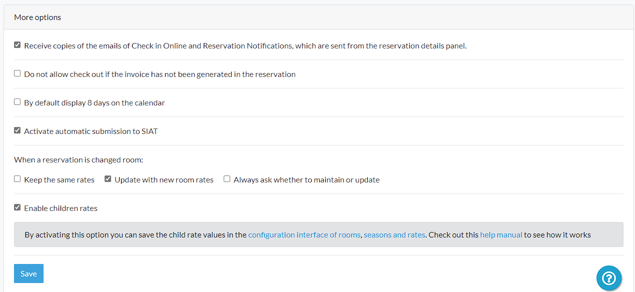 Other options allow you to limit the reception functions where you can force the system not to generate check out without invoice, view the calendar for several days in the same block, keep the rates when guests change rooms and increase the rates for children.