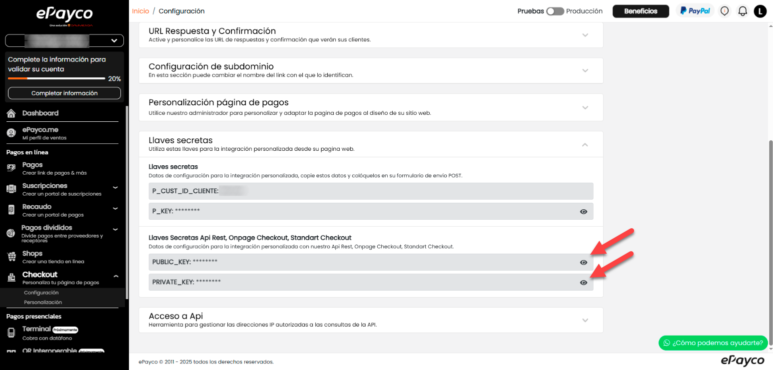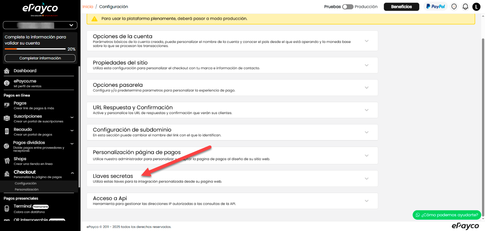 Después de dar clic en “Checkout/Configuración” se desplegarán otras opciones, debes seleccionar “Llaves secretas” como se muestra en la siguiente imagen: