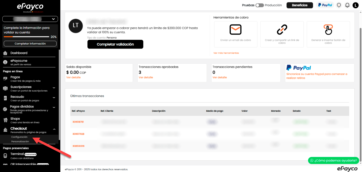 Al iniciar sesión, te aparecerá la pantalla y el menú principal de la plataforma. Debes desplazarte por el menú hasta la opción “Checkout / Configuración” y dar clic.
