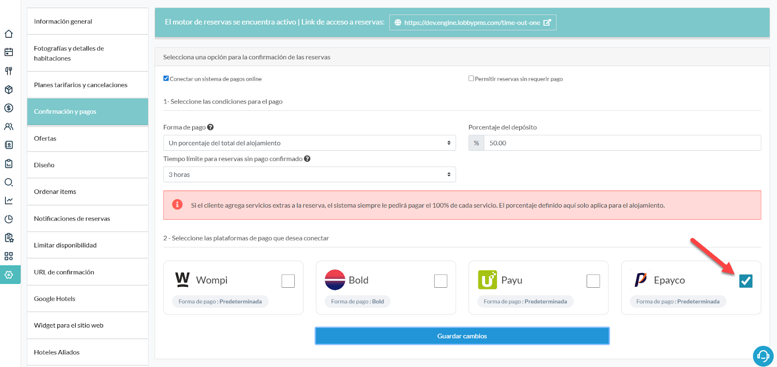 Es posible que para activar esta opción el sistema te solicite activar una forma de pago predeterminada para el motor de reservas. Si no sabes cómo hacerlo, visita este manual: Activar la forma de pago para el motor de reservas
