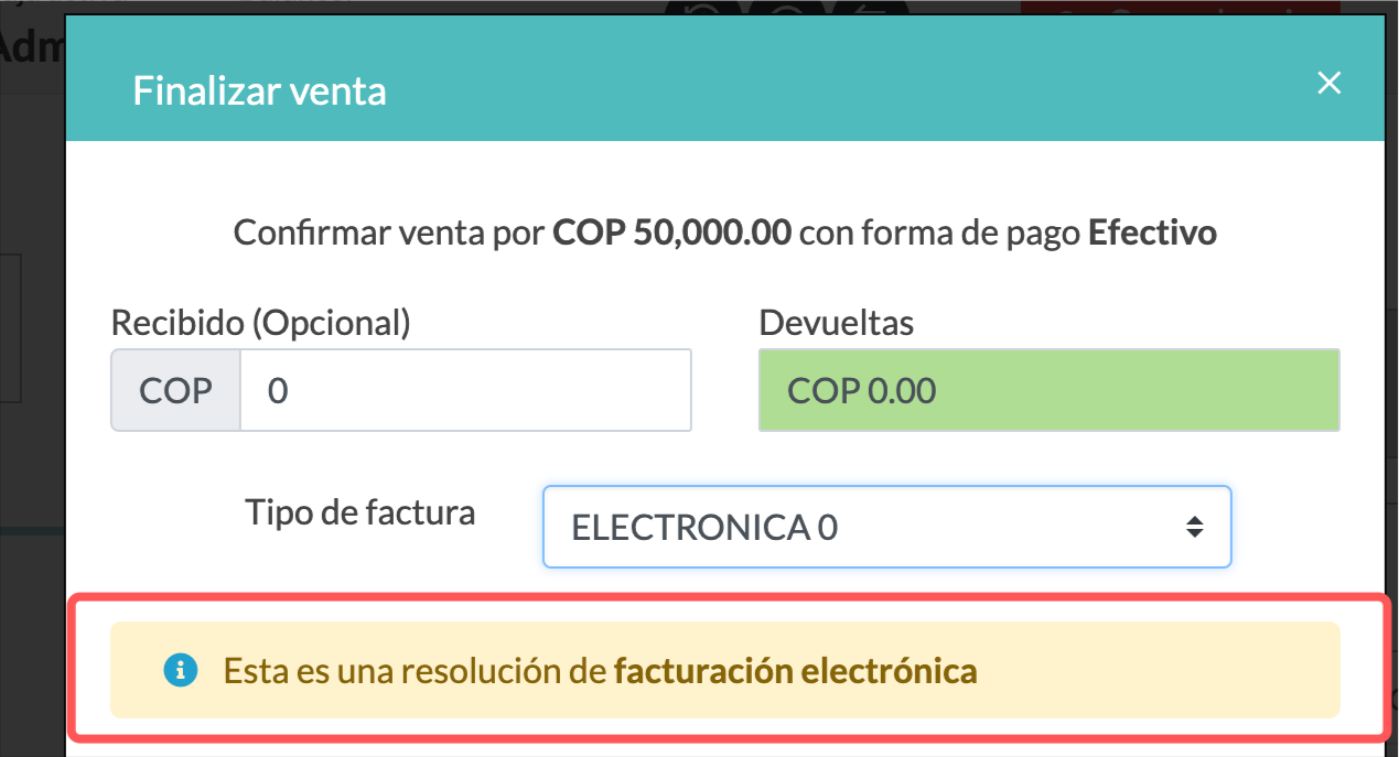 ✔️ Cuando selecciones el tipo de factura electrónica, debajo podrás ver un mensaje confirmando que “Esta es una resolución de facturación electrónica”.