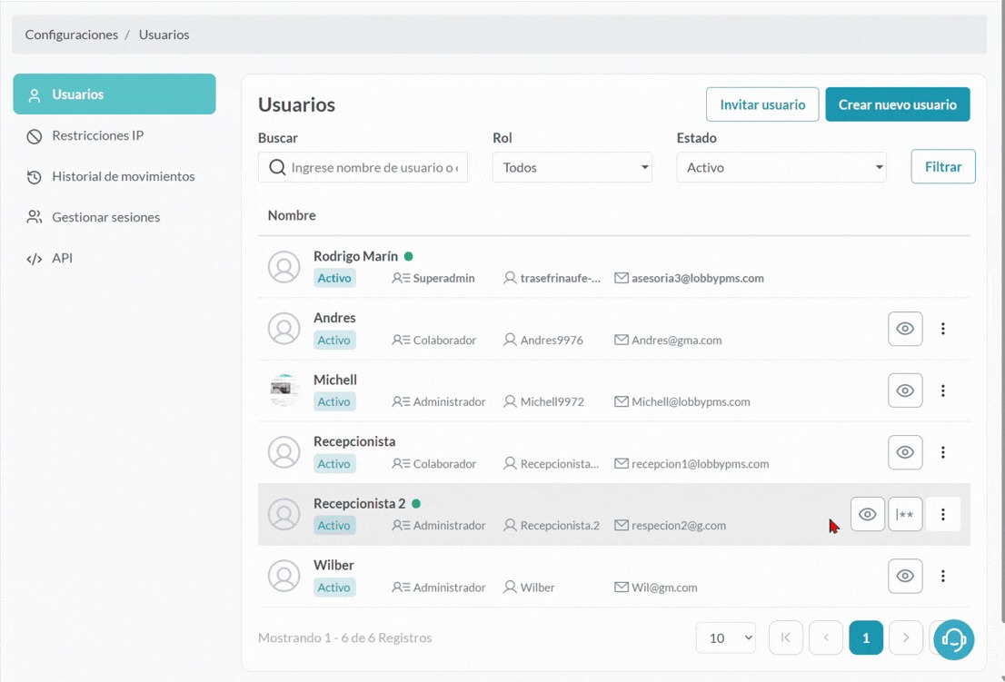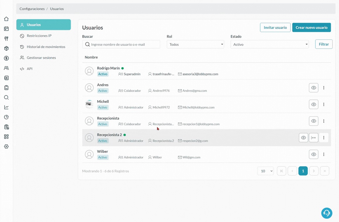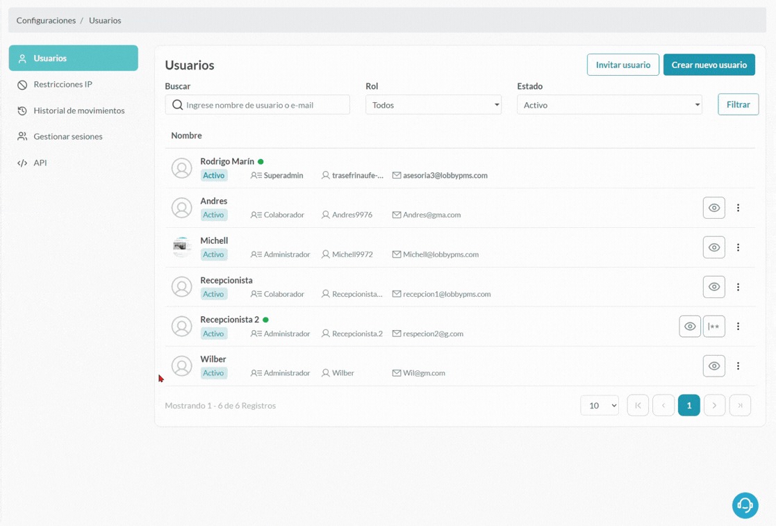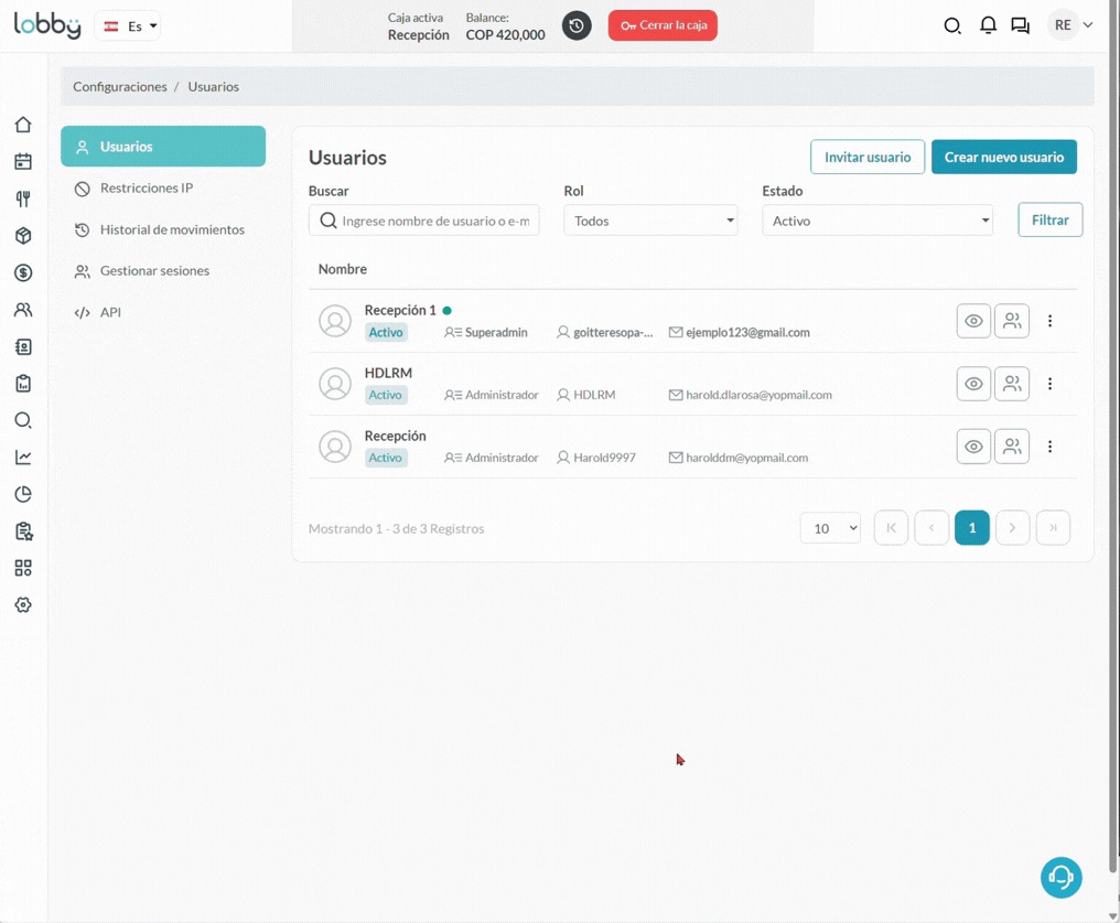 Utilice las siguientes funciones para crear y gestionar los usuarios de su equipo de trabajo. Cree nuevos usuarios y asigne permisos y restricciones de acceso. Si desea usar el API para desarrolladores utilice los accesos que se mencionan en esta guía. La nueva interfaz de usuarios, permisos y API dentro de Lobby ha sido diseñada para ofrecer una experiencia más intuitiva y eficiente en la gestión de usuarios y sus actividades.