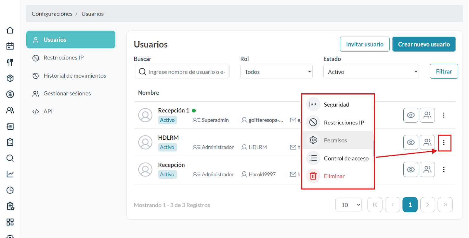 En opciones de usuarios tendrás acceso para cambiar contraseñas, agregar restricciones de IP para el usuario, visualizar los permisos y el control de acceso, por último la opción de eliminar el usuario.