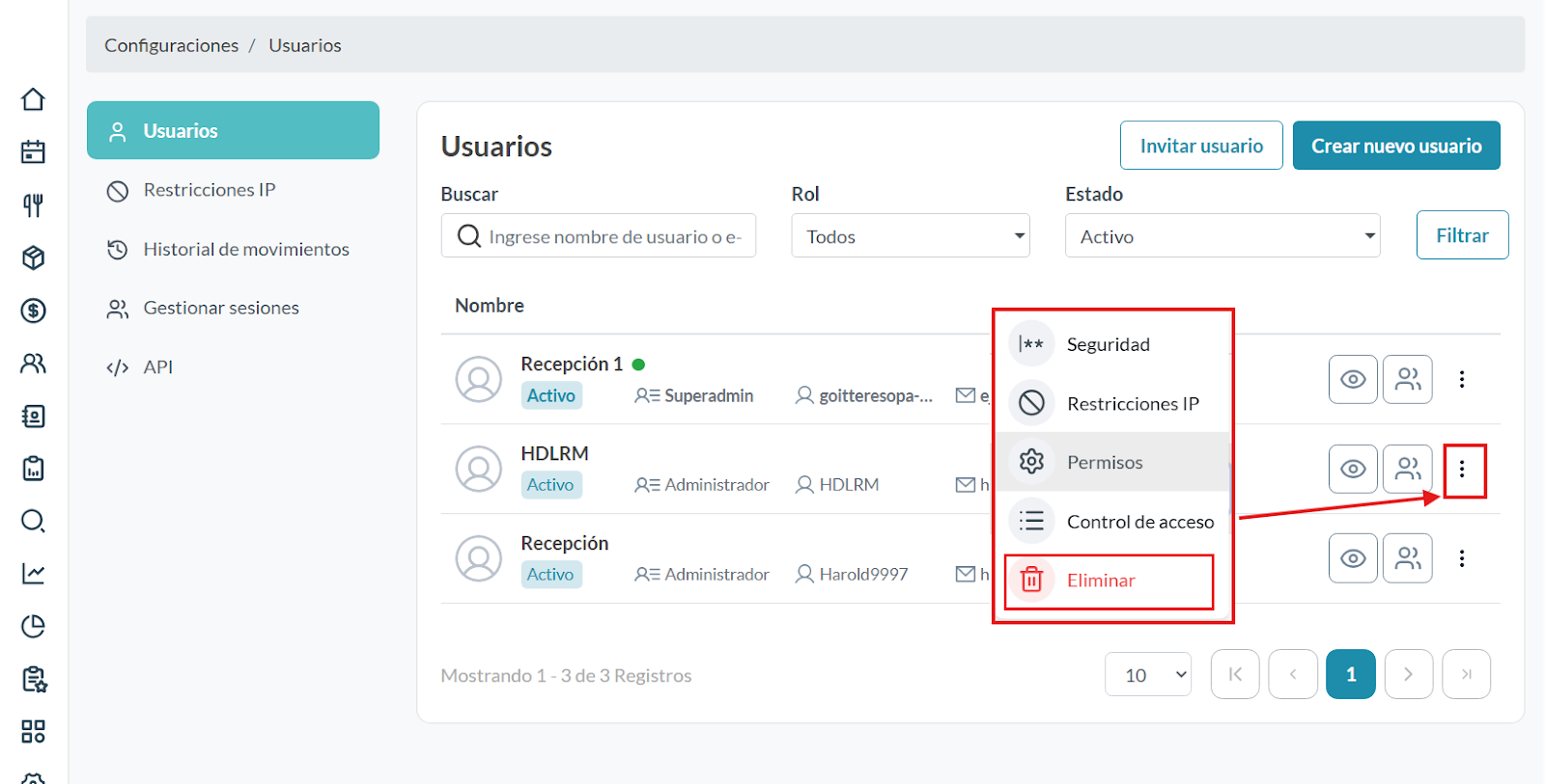 Para eliminar un usuario debes dirigirte a las opciones del usuario que quieres eliminar y ubicas la opción de eliminar.