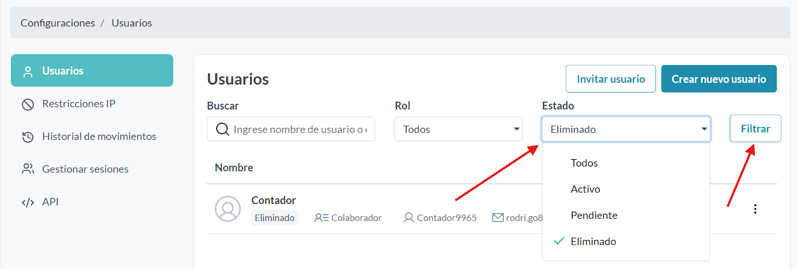 Si quieres encontrar los usuarios eliminados debes en el filtro de estado debes aplicarlo en eliminados y oprimir en filtrar, te mostrará el listado de usuarios eliminados.