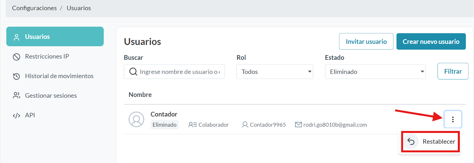 Para restablecer un usuario eliminado debes ingresar a opciones de usuario y das clic en restablecer.