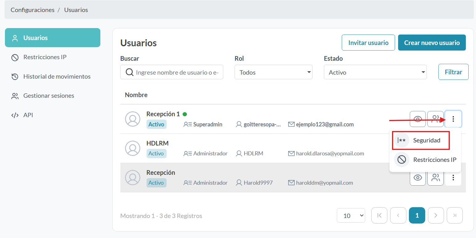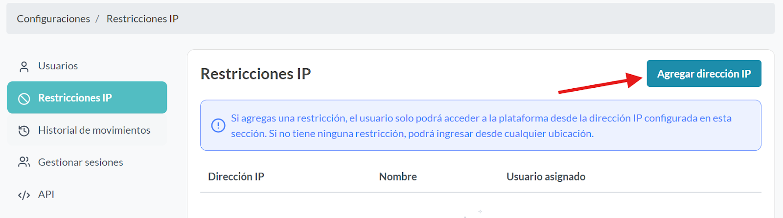 Si necesitas aplicar alguna restricción de IP a un usuario debes oprimir en el costado superior derecho de la interfaz.