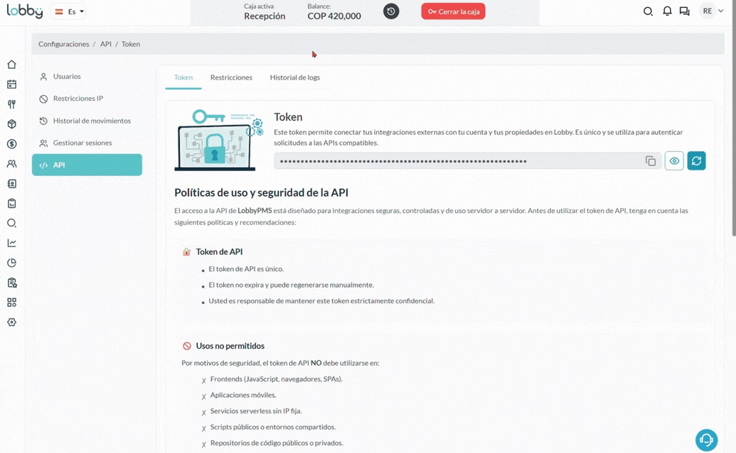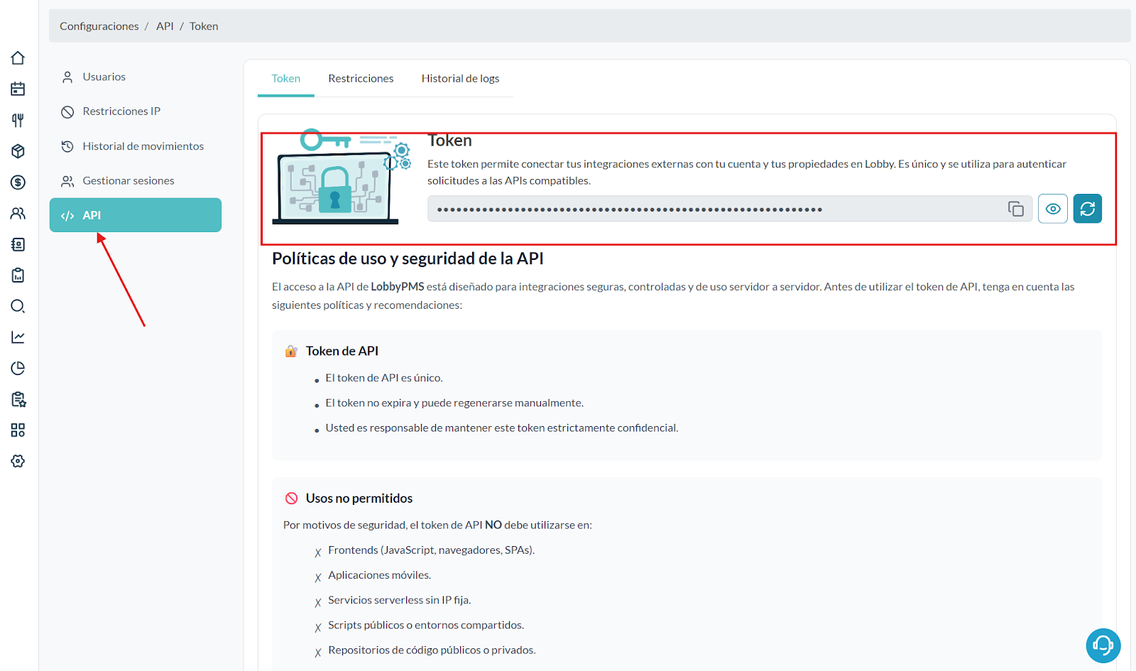 El API es la llave que se utiliza para realizar integraciones entre Lobby y LobbyBookings (Channel Manager de Lobby) o para importar lista de productos de una propiedad a otra, Para ello debes ingresar a API en el costado izquierdo de la interfaz de usuarios y encontrarás el Token de tu propiedad y las políticas de uso y seguridad de la API: