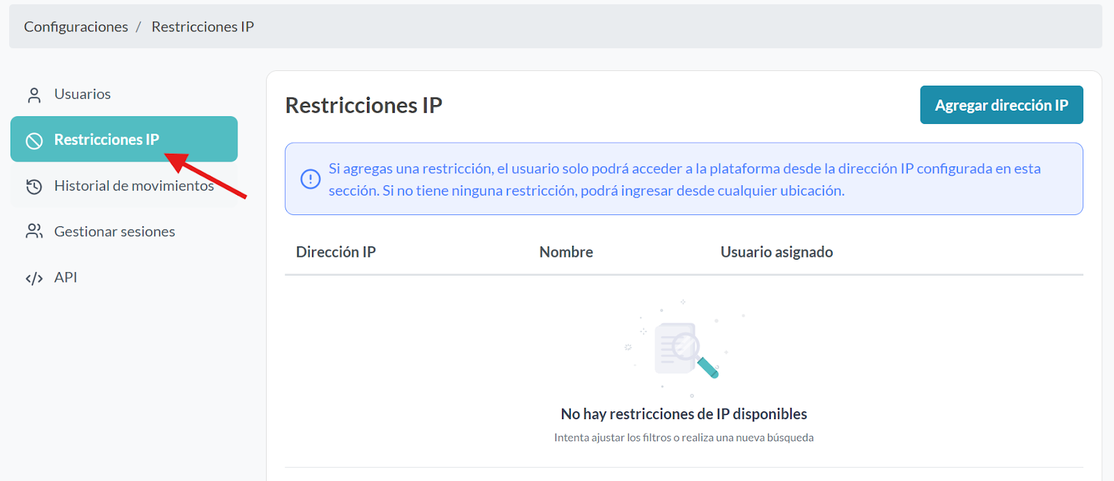 Las restricciones de IP se refieren al control de acceso basado en las direcciones IP desde las cuales los usuarios intentan conectar con el PMS. Este mecanismo permite definir qué direcciones IP están autorizadas para acceder al sistema. Si no establece ninguna, sus usuarios podrán acceder desde cualquier lugar del mundo. Para ingresar a restricciones de IP lo ubicas en la parte izquierda de la interfaz.
