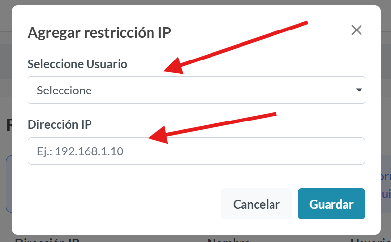 Se desplegará una ventana en la cual debes seleccionar el usuario a aplicar la restricción e ingresar la IP pública del ordenador desde la cual podrá acceder.