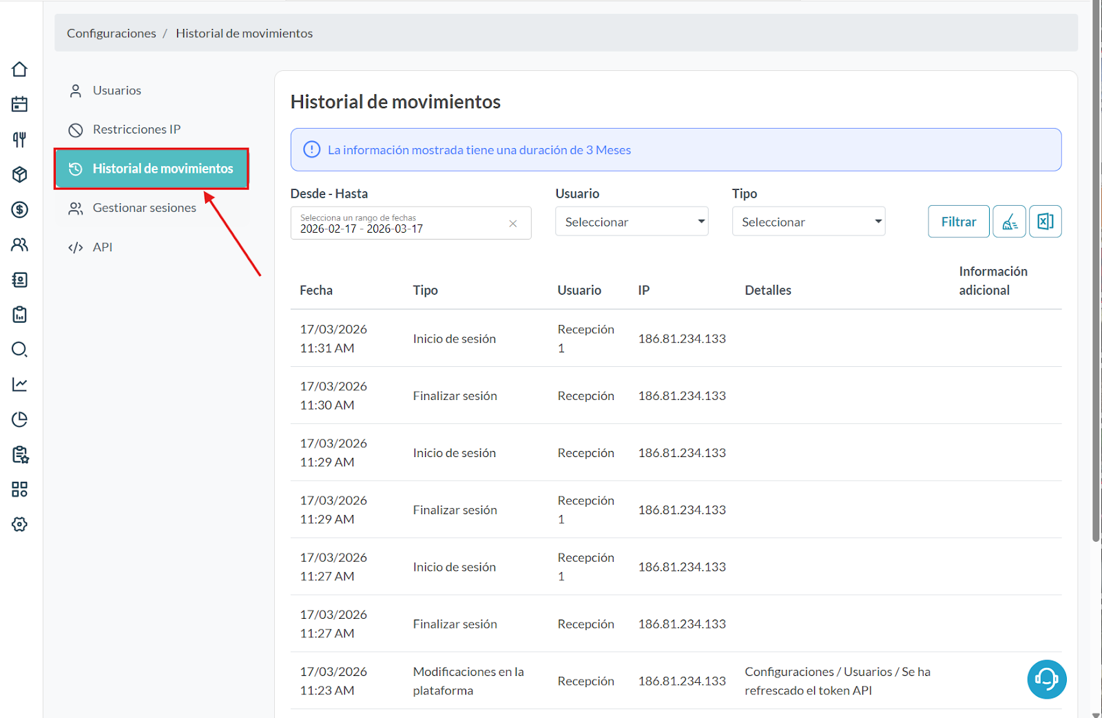 Este listado puede ser filtrado por fechas, usuarios y tipo de movimiento, además de contar con la opción de descargar el historial en formato Excel.
