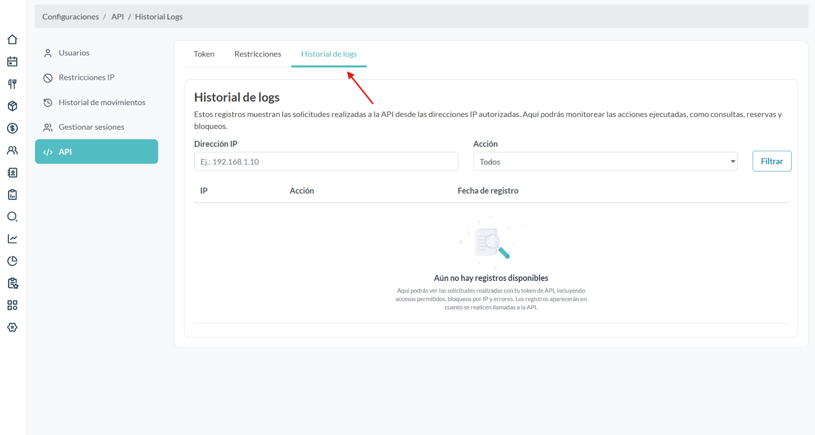 Por último encontrarás la pestaña de historial de Logs la cual contiene el registro de solicitudes de peticiones realizadas a los servidores de Lobbypms mediante su token. Puede visualizar la IP que realizó la petición, la fecha y el tipo de petición realizada.