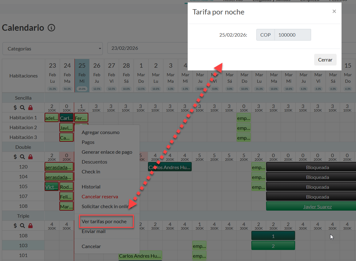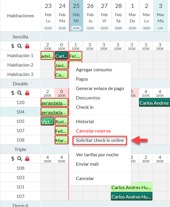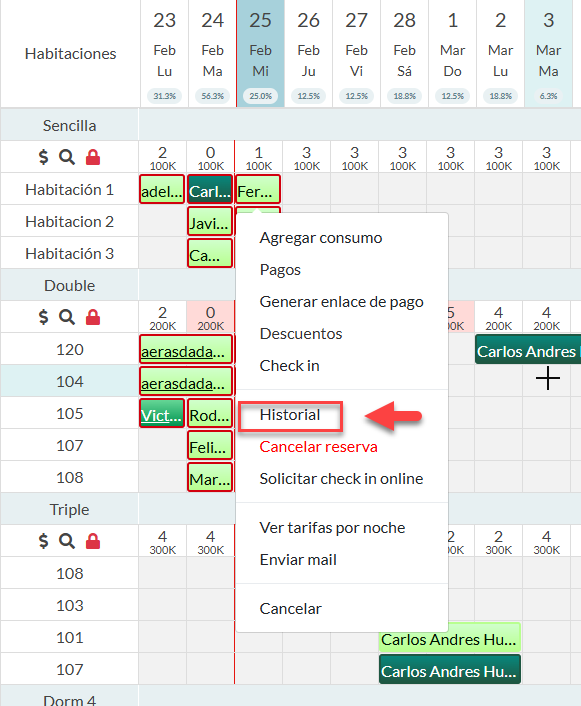 Haga uso de las funciones rápidas en el calendario por medio del menú de opciones que se despliegan al hacer clic derecho en una reserva. A continuación, le mostramos las funcionalidades.
