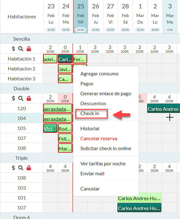 Esta función permite hacer check-in de manera rápida sin ingresar a la interfaz de la reserva.