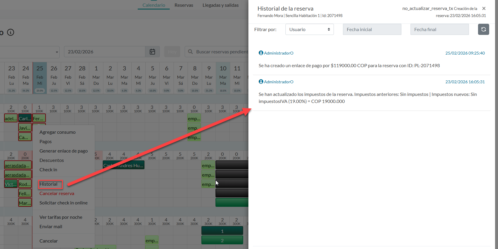 Esta función muestra el módulo donde está el historial de las acciones que se han realizado en la reserva. Ejemplo, quién y cuándo recibió un pago, si se realizó el check-in, etc.