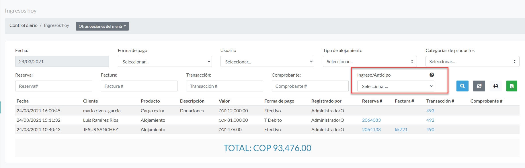 1- Menú control diario > Ingresos y anticipos hoy: