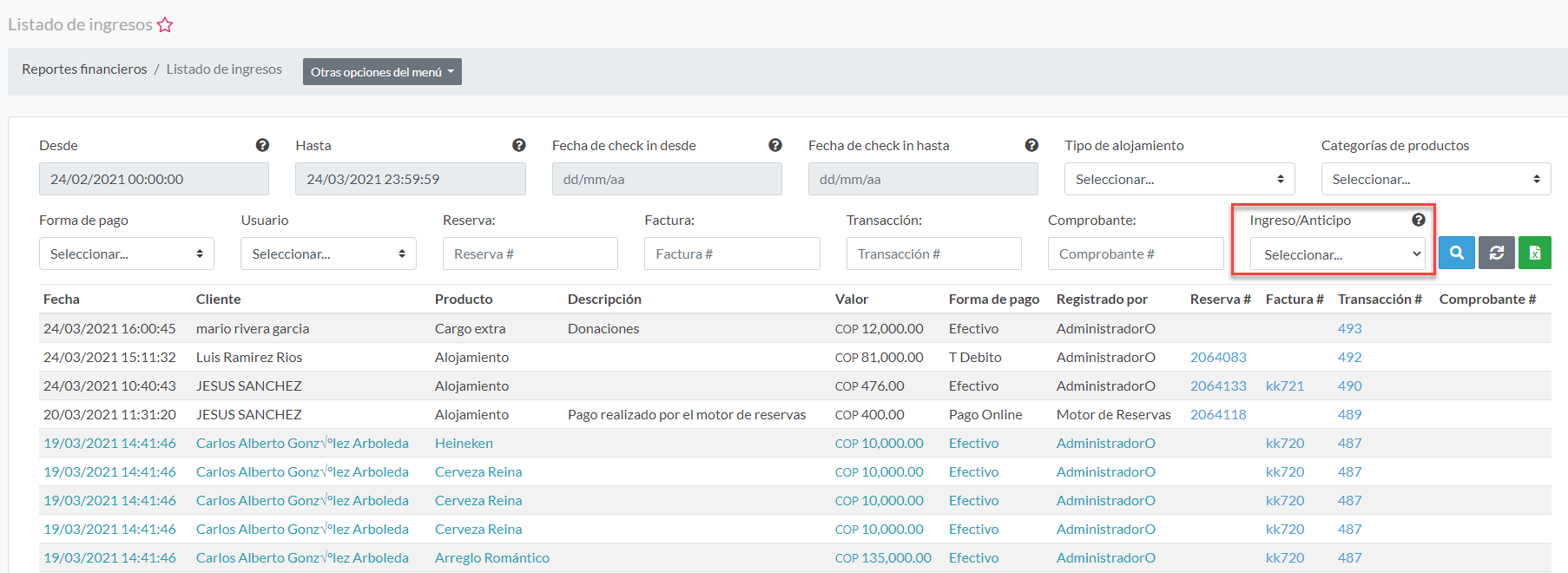 - En este reporte encontrará todos los pagos registrados en los últimos 30 días y con la opción de buscar en el rango de fechas que desee y filtrando por tipo de servicio. Use el filtro ingreso/anticipo para listar solo los ingresos o solo los anticipos del día.