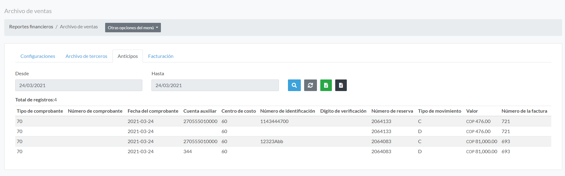 2- Menú reportes financieros > Listado de ingresos y anticipos