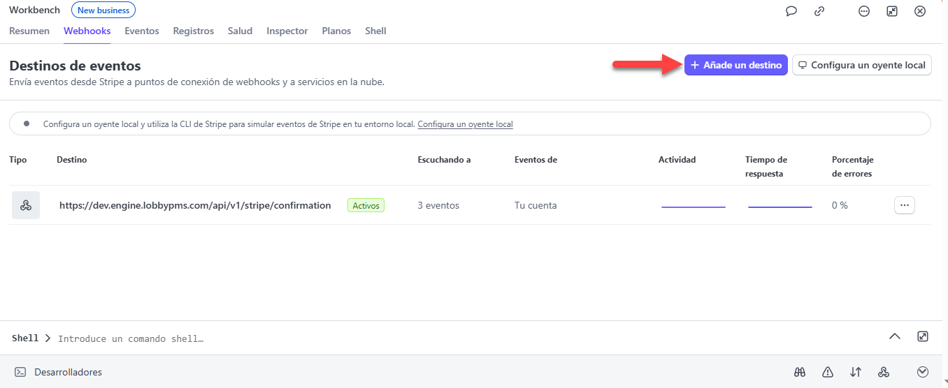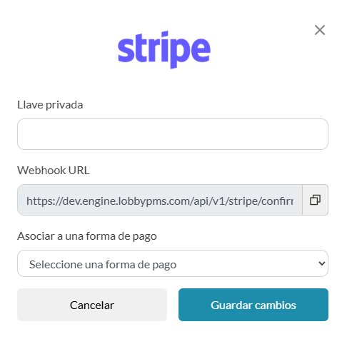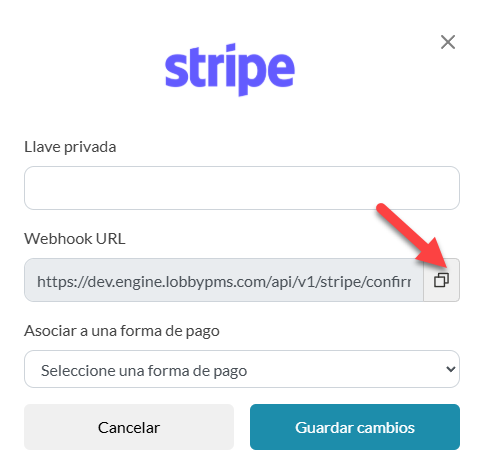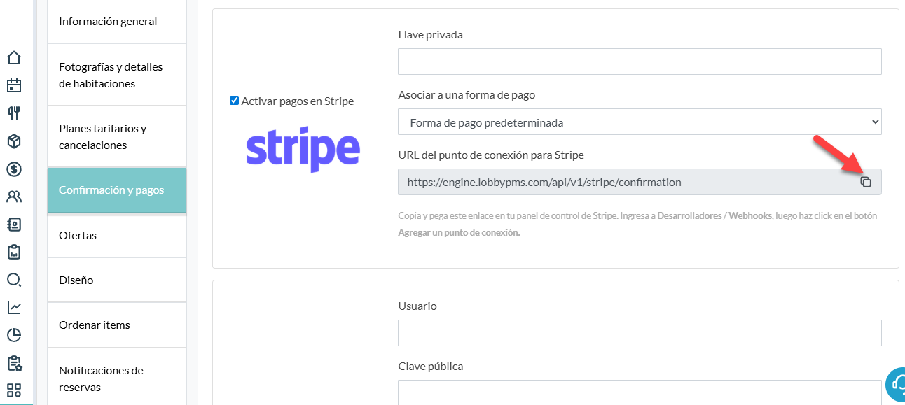 En LobbyPMS encontrarás el enlace correspondiente al punto de conexión para Stripe. Copia este enlace y pégalo en el panel de control de Stripe.