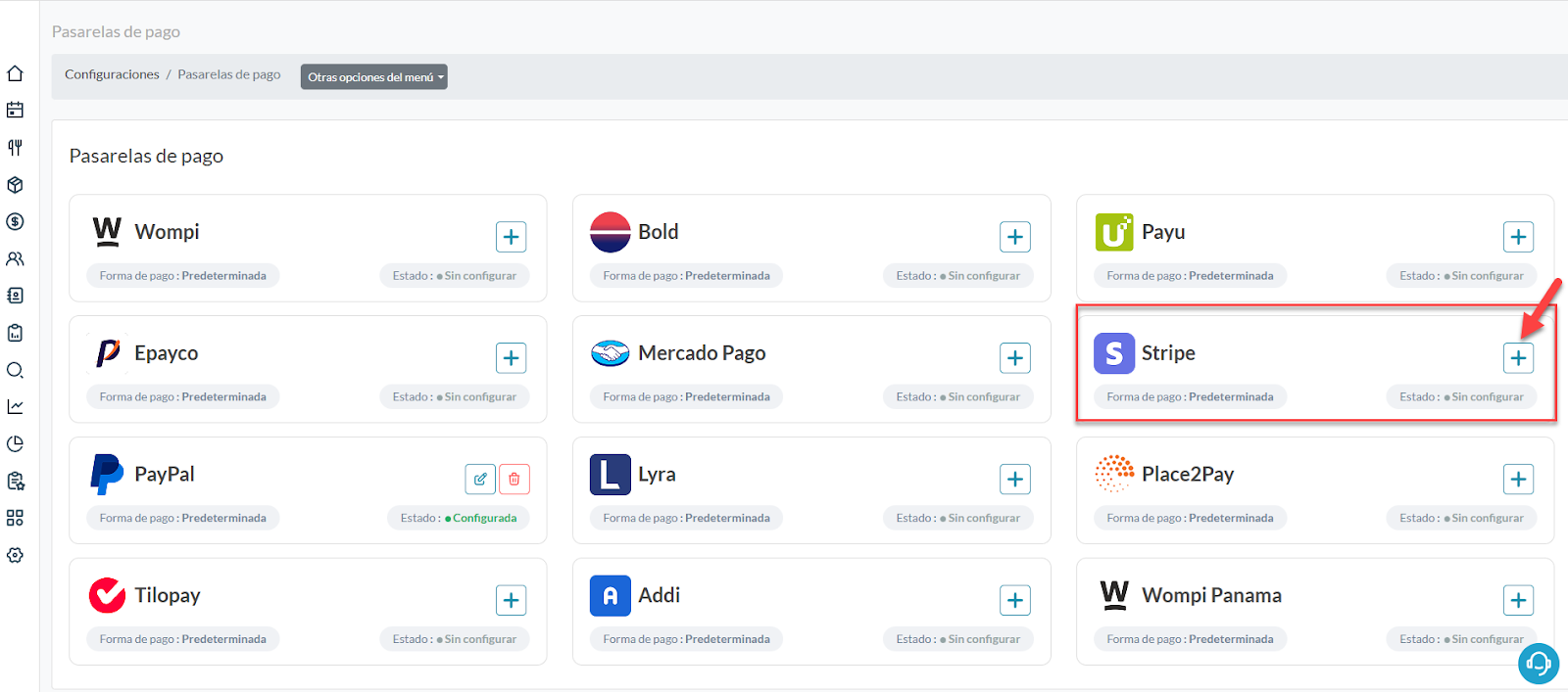 Ingresa al menú Configuraciones > Pasarelas de pago