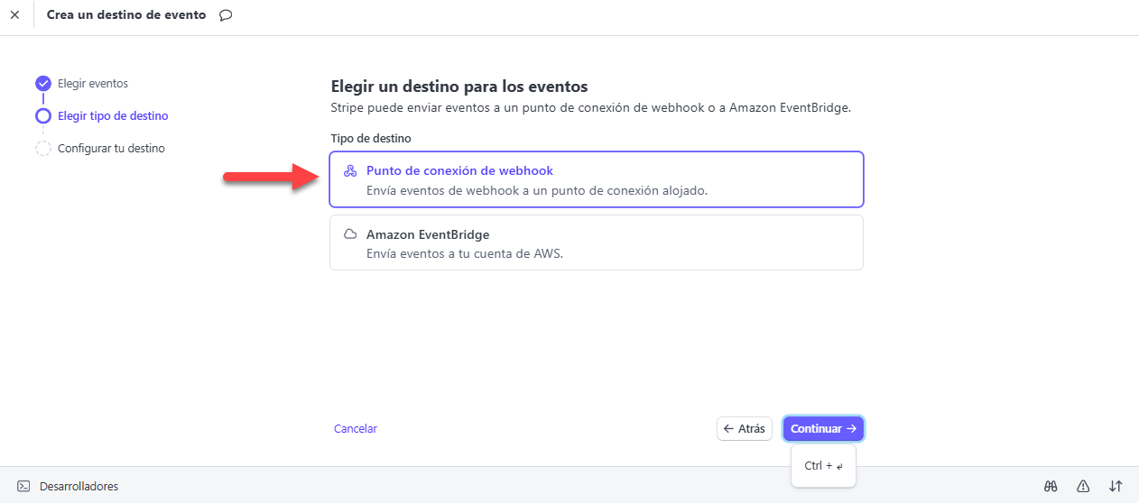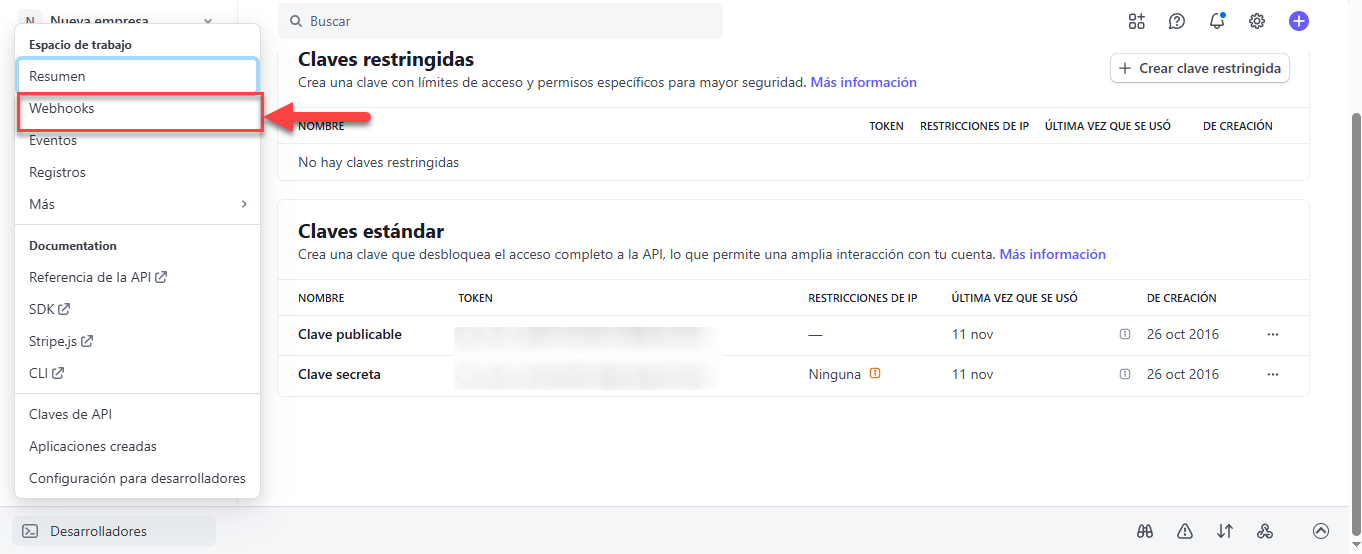En tu cuenta de Stripe dirígete a la sección "Desarrolladores>>"Webhooks".