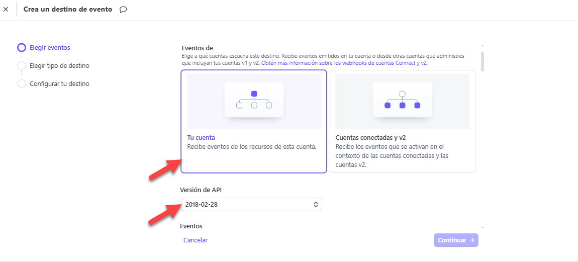 En la sección "Eventos" te aparecerán varias opciones de eventos disponibles, te vas a dirigir a “Check out” y marcarás la casilla de verificación “Elegir todos los eventos de checkout” para activar las 4 opciones de Check Out. Das clic en Continuar.