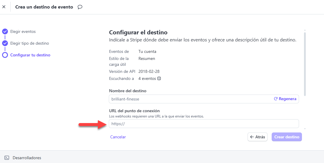 En la interfaz te aparecerá el recuadro en blanco para pegar la URL del punto de conexión y crearas el destino.