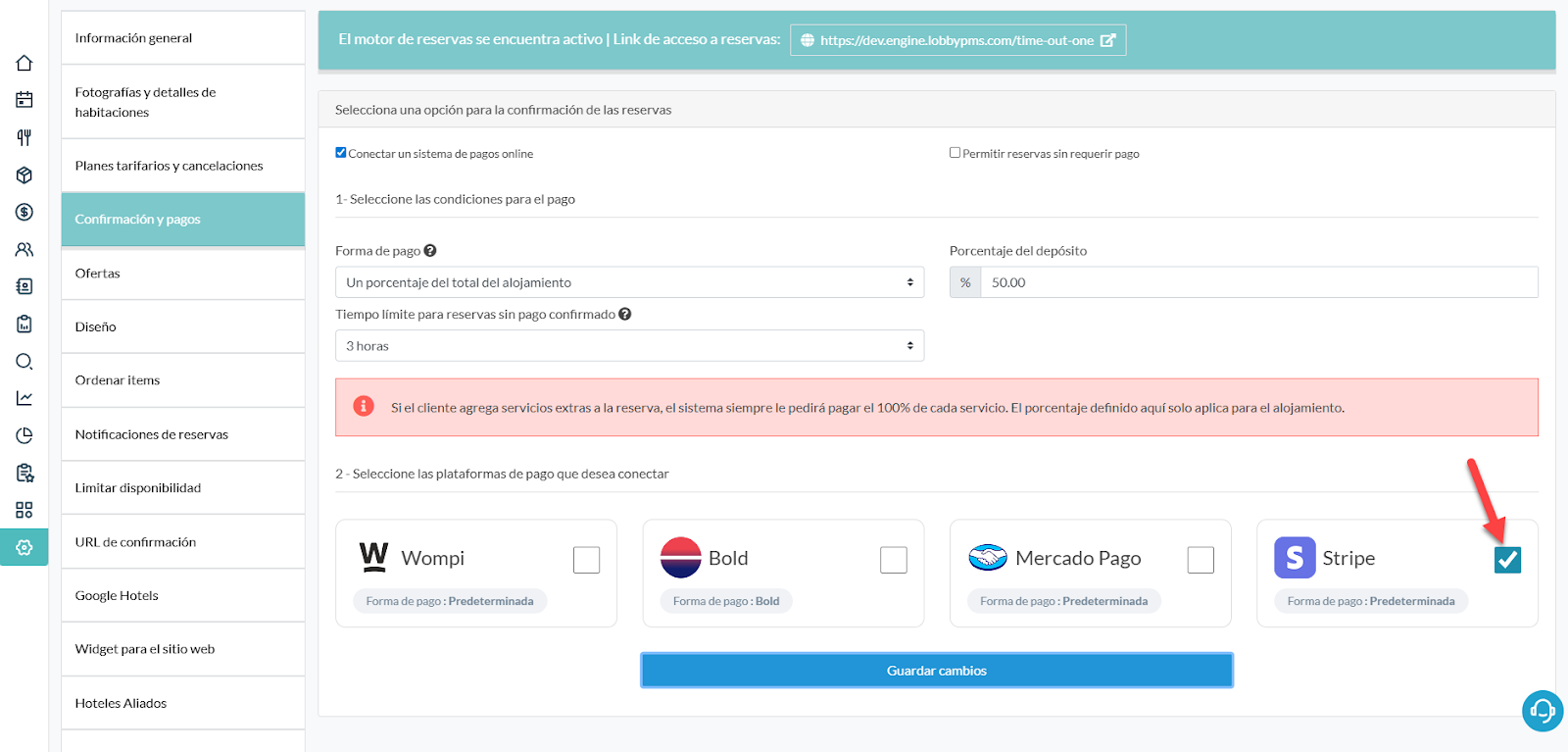 Es posible que para activar esta opción el sistema te solicite activar una forma de pago predeterminada para el motor de reservas. Si no sabes cómo hacerlo, visita este manual: Activar la forma de pago para el motor de reservas
