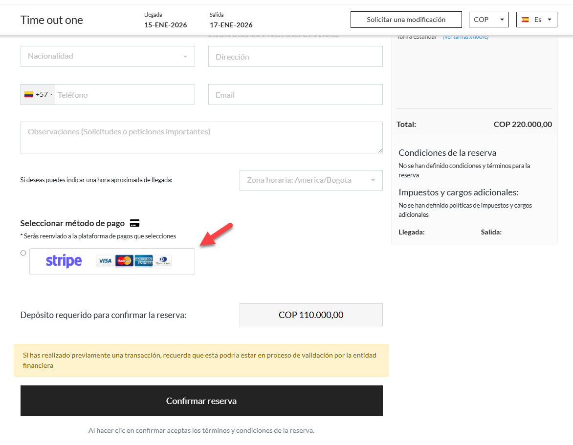 Puedes ingresar al motor de reservas y realizar una prueba con una reserva para verificar que el botón de Stripe esté activo al momento de completar la reserva.
