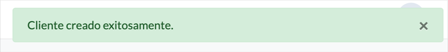 Al dar clic en “Crear” te aparecerá un notificación en parte superior derecha de la pantalla indicando que el cliente se ha creado exitosamente.
