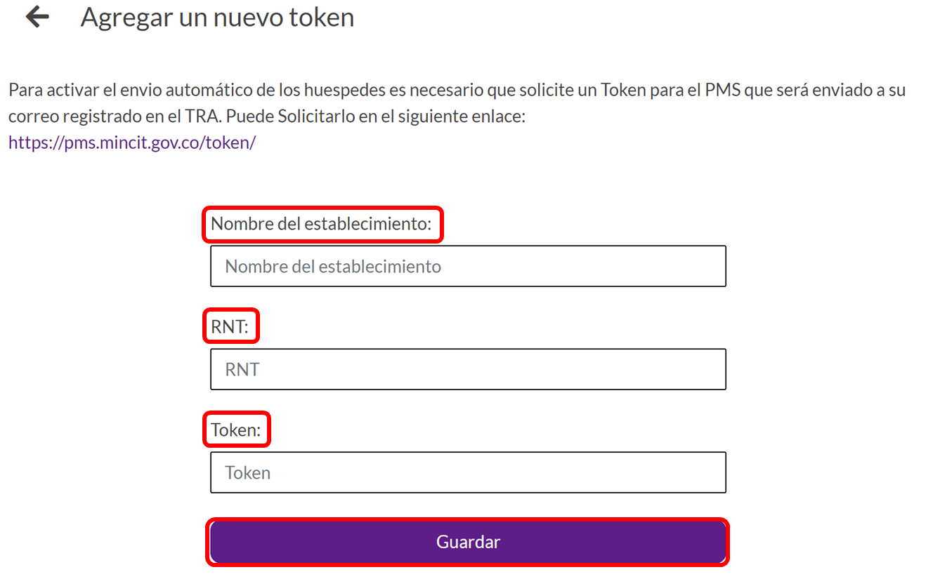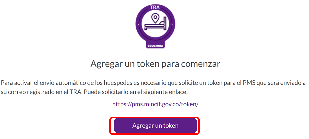 Con ese token activaremos el envío automático de la TRA de los huéspedes. Recuerda que cada prestador de servicio de alojamiento cuenta con un Registro Nacional de Turismo (RNT) y debe digitarlo en este enlace: https://pms.mincit.gov.co/token/ con esto te enviarán el token por correo electrónico.