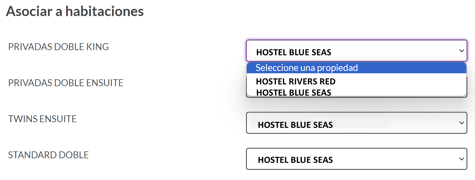 Por ejemplo: Yo quiero que la habitación “Privadas Doble King” quede asociada con el “Hostel Rivers Red” que registré anteriormente. Para esto, ubicaré el nombre de la habitación y seleccionaré el recuadro en blanco que aparece al lado para escoger mi opción.