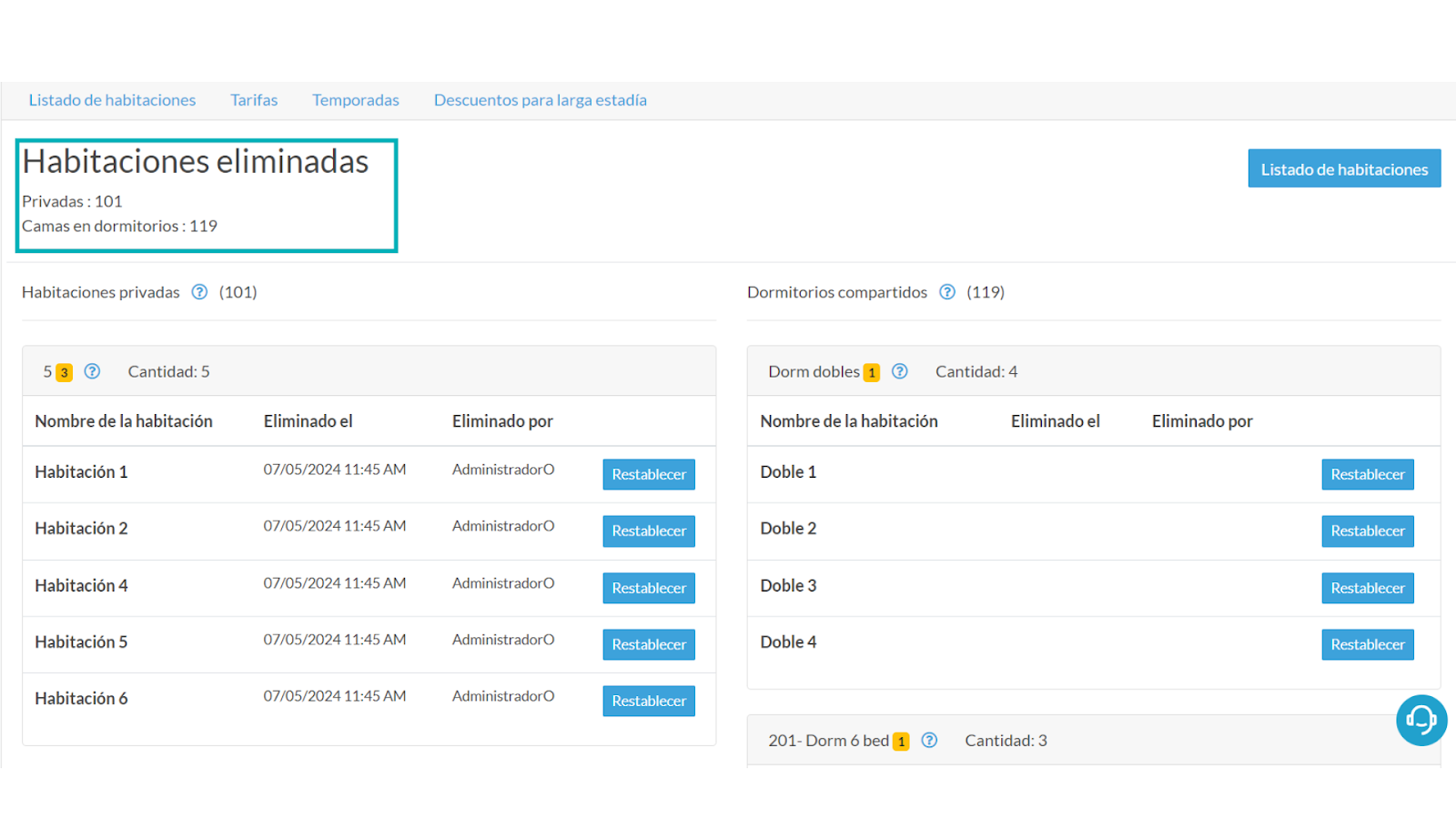 Allí podrás ver la lista de habitaciones, temporadas y las tarifas que tienes para cada una de ellas. En el costado superior derecho de la pantalla, verás el nuevo botón de Habitaciones eliminadas.
