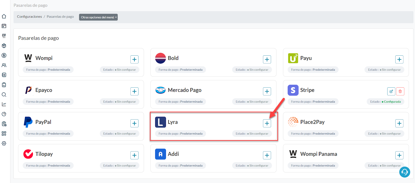 Es posible que para activar esta opción el sistema te solicite activar una forma de pago predeterminada para el motor de reservas. Si no sabes cómo hacerlo, visita este manual: Activar la forma de pago para el motor de reservasHaz clic en el icono agregar en la opción Lyra.