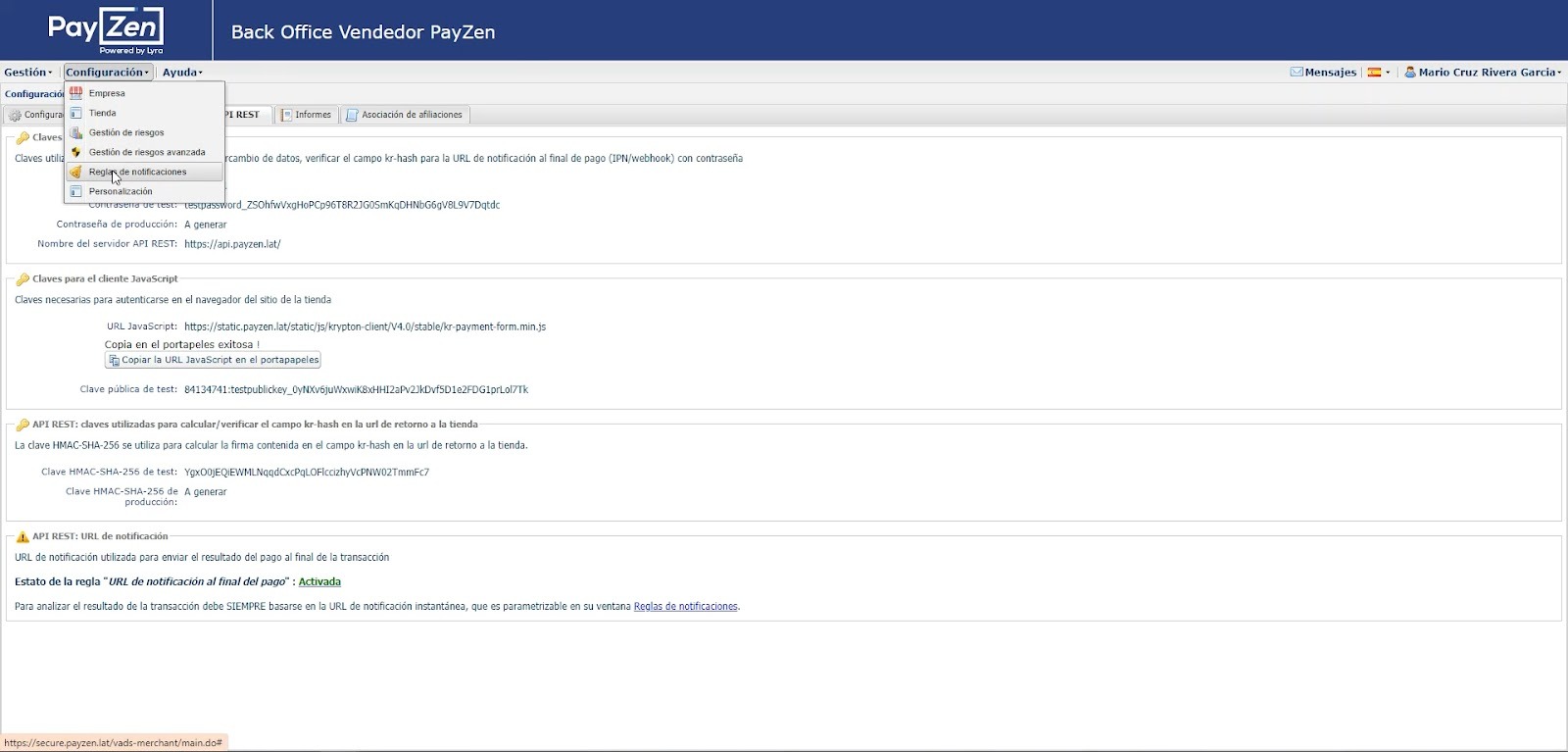 - Una vez en el Back Office de Lyra, dirígete a “Configuración” > Regla de notificaciones