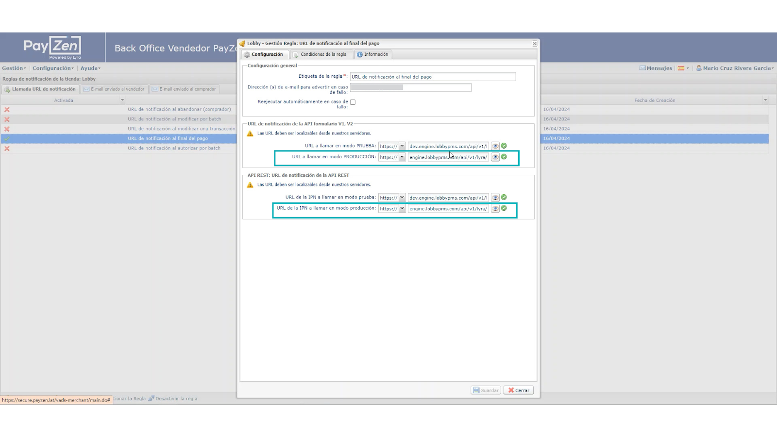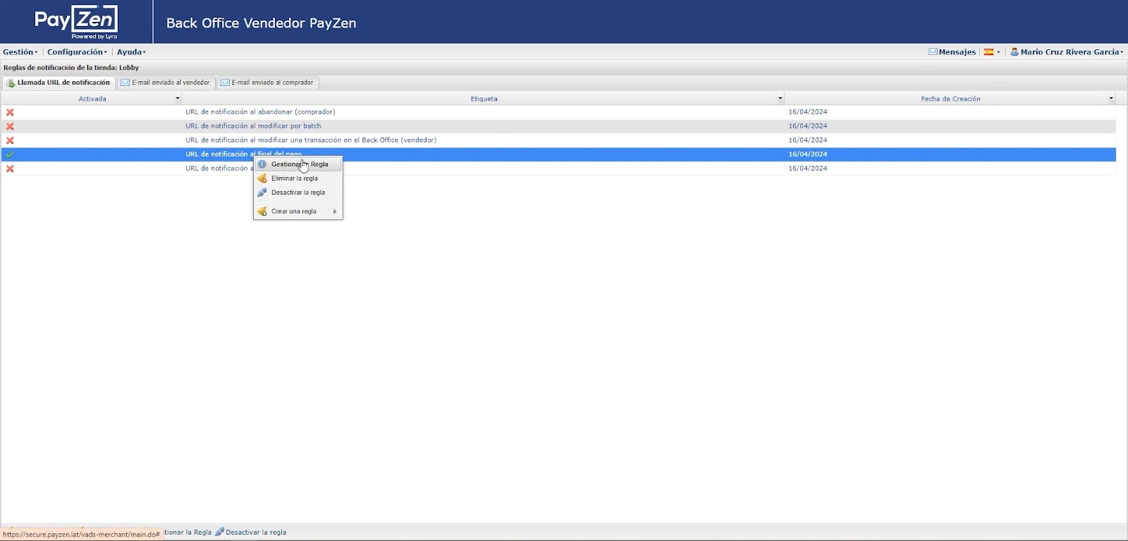 - Da clic derecho sobre la URL de notificación al final del pago > gestionar regla