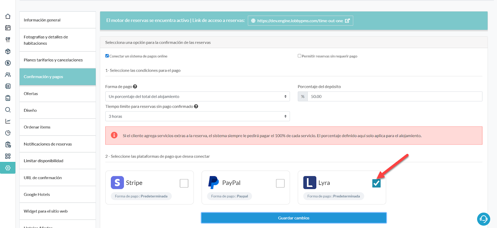 Ingresa al menú Configuraciones > Motor de reservas > Opción Confirmación y pagos. Asegúrate de que tengas activa la opción Conectar un sistema de pagos online.