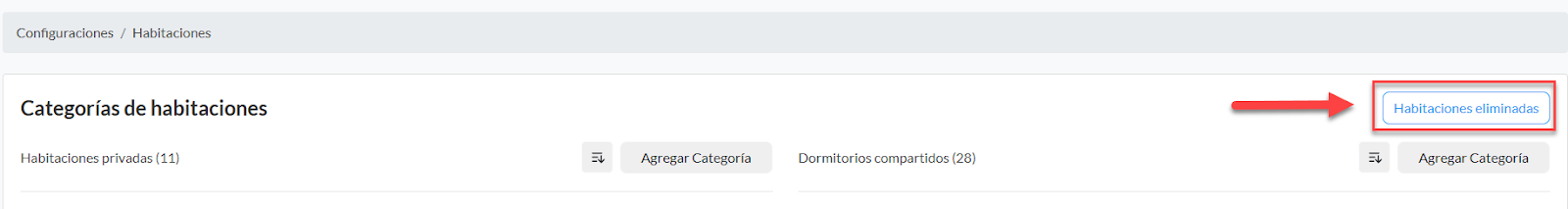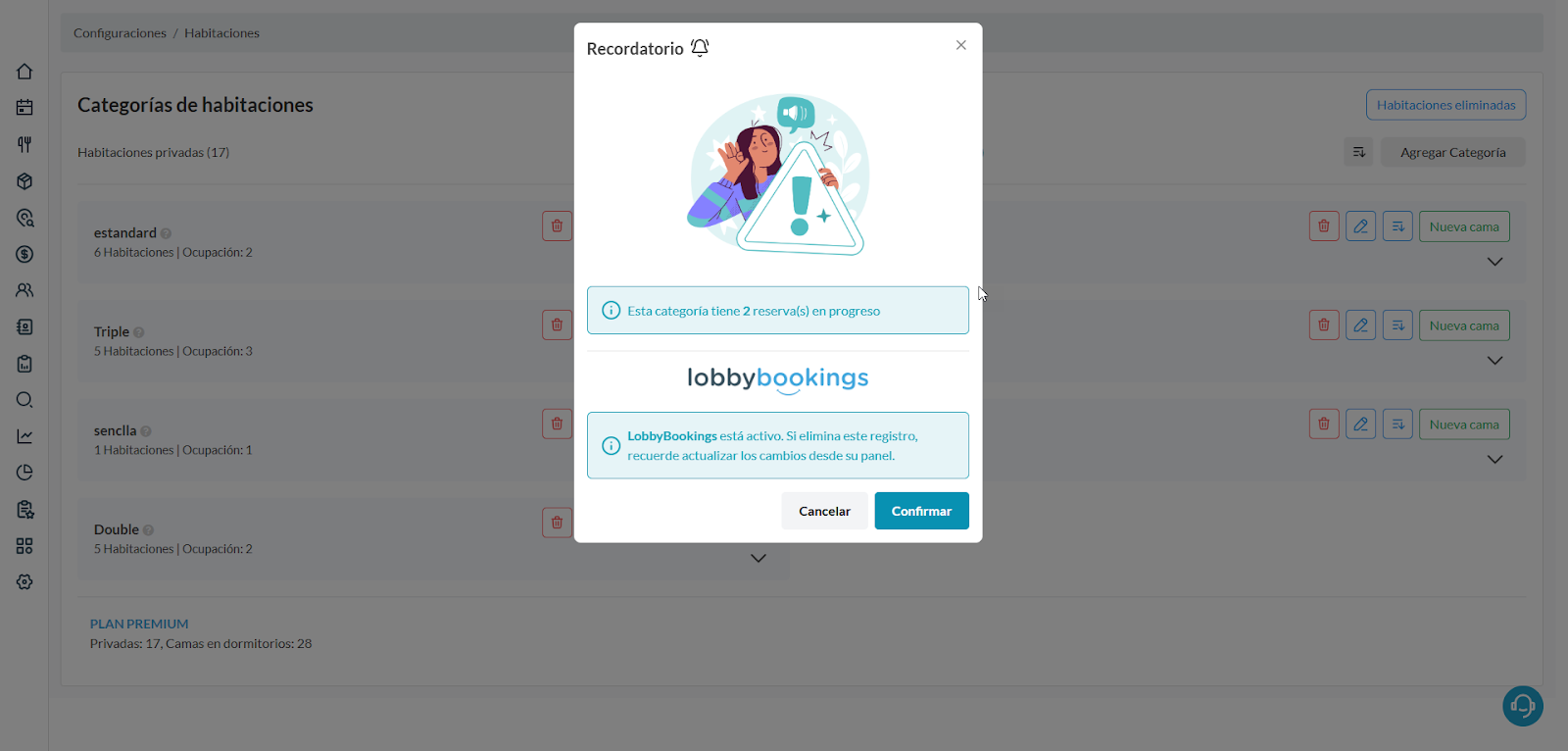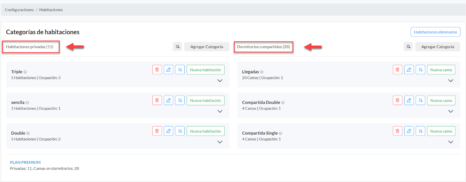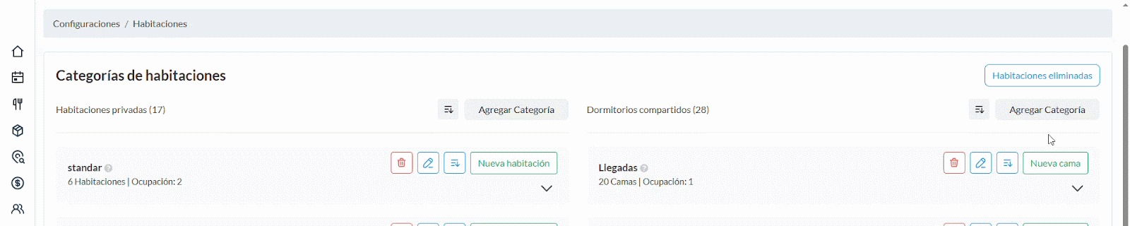 Nota: Para eliminar una categoría, revisa que no tengas reservas activas en las habitaciones, ya que debes cancelarlas una a una para que te permita eliminar la categoria.