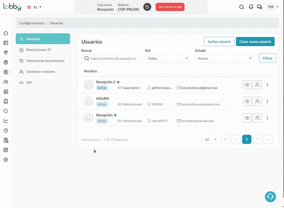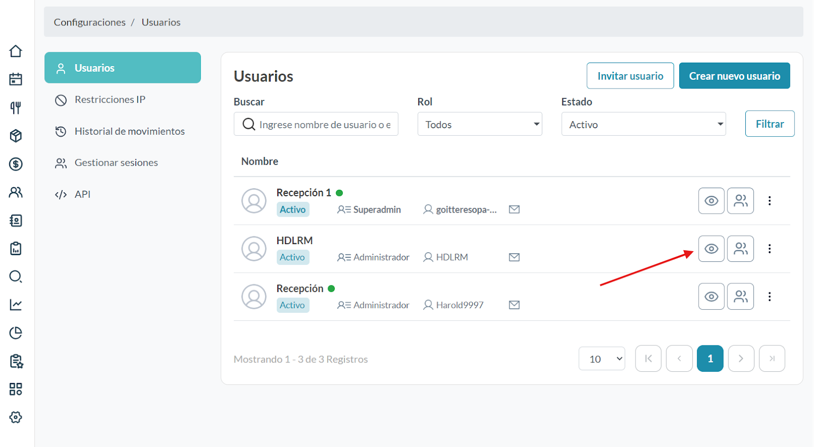 En el listado de usuarios activos verás todos los usuarios que cuentan con permisos de inicio de sesión a la cuenta de tu hotel, cada uno de ellos cuenta con algunos permisos y restricciones, en caso de que aún no hayas realizado esta configuración, da clic aquí.