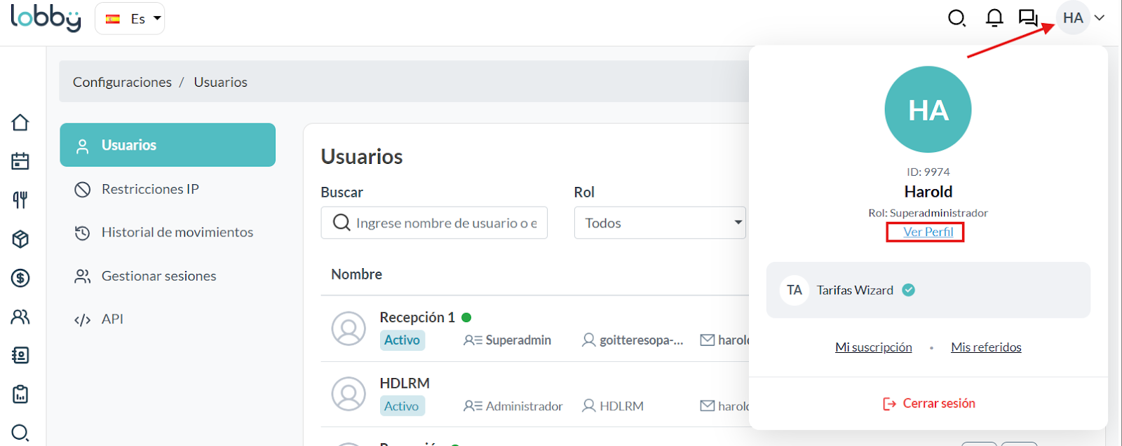 En caso de que seas el Superadmin podrás hacer esta configuración en todos los usuarios que hacen parte de tu organización, de igual forma si el rol de tu perfil es de administrador podrás administrar este permiso para todos a excepción del perfil Superadmin el cual no podrás modificar:
