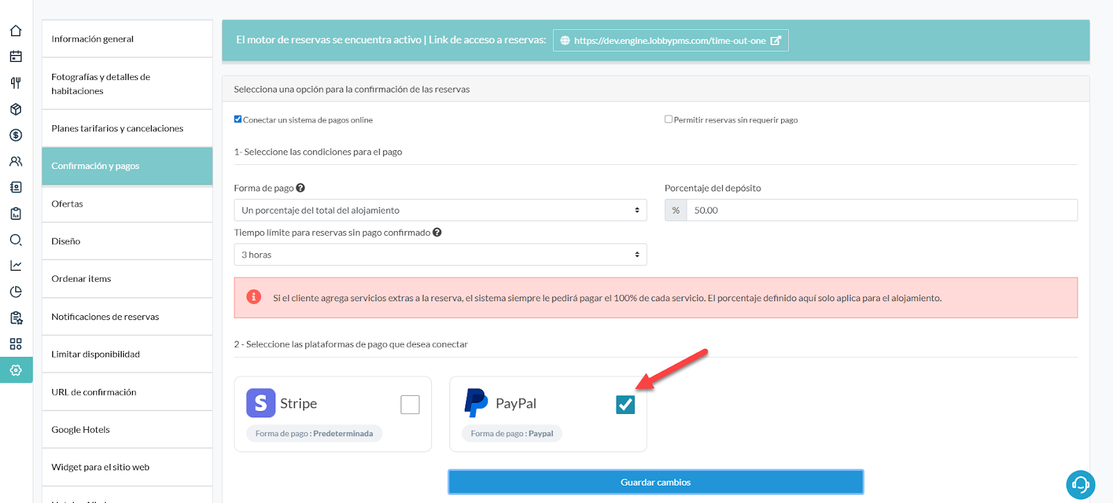 Es posible que para activar esta opción el sistema te solicite activar una forma de pago predeterminada para el motor de reservas. Si no sabes cómo hacerlo, visita este manual: Activar la forma de pago para el motor de reservas