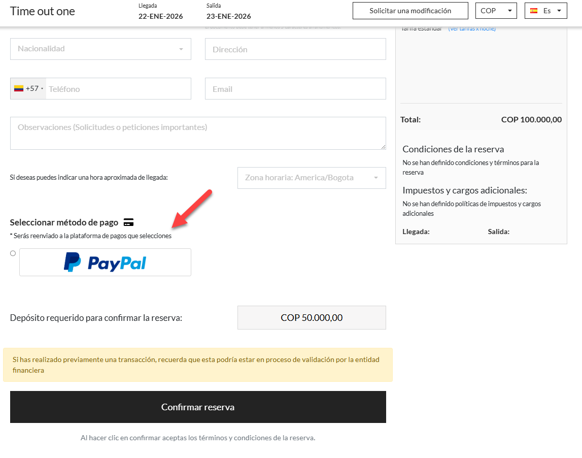 Puedes ingresar al motor de reservas y realizar una prueba con una reserva para verificar que el botón de PayPal esté activo al momento de completar la reserva.