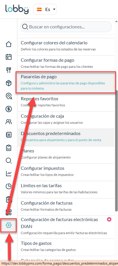 12. Ahora accede a tu cuenta de LobbyPMS e ingresa al menú Configuraciones, Pasarelas de pagos.