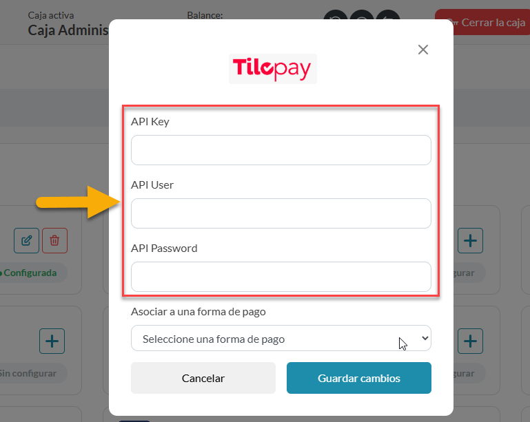 13. Aquí seleccionarás la pasarela de pago para activarla. Das clic en el botón + y aparecerá el modal donde pondrás toda la información brindada por Tilopay: API key, API usuario y API password.
