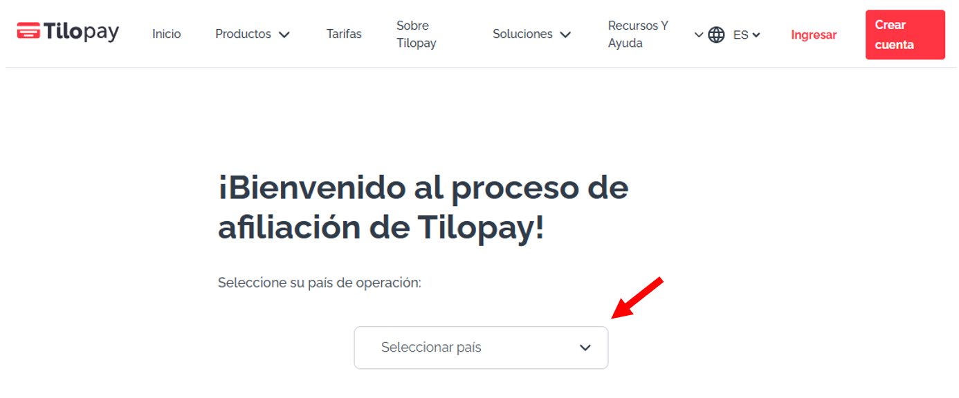 - Al dar clic en crear cuenta, te llevará a la página de https://tilopay.com/start donde podrás escoger el país de afiliación.