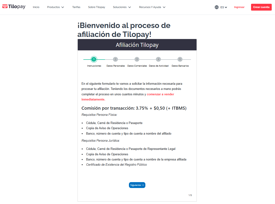 Una vez le des clic en siguiente, debes seguir el paso a paso que te brinda Tilopay para crear tu cuenta, completar los datos y documentación solicitados en el formulario de afiliación. Para finalizar la creación de la cuenta y esperar 1 a 2 días hábiles para que la cuenta esté activa.