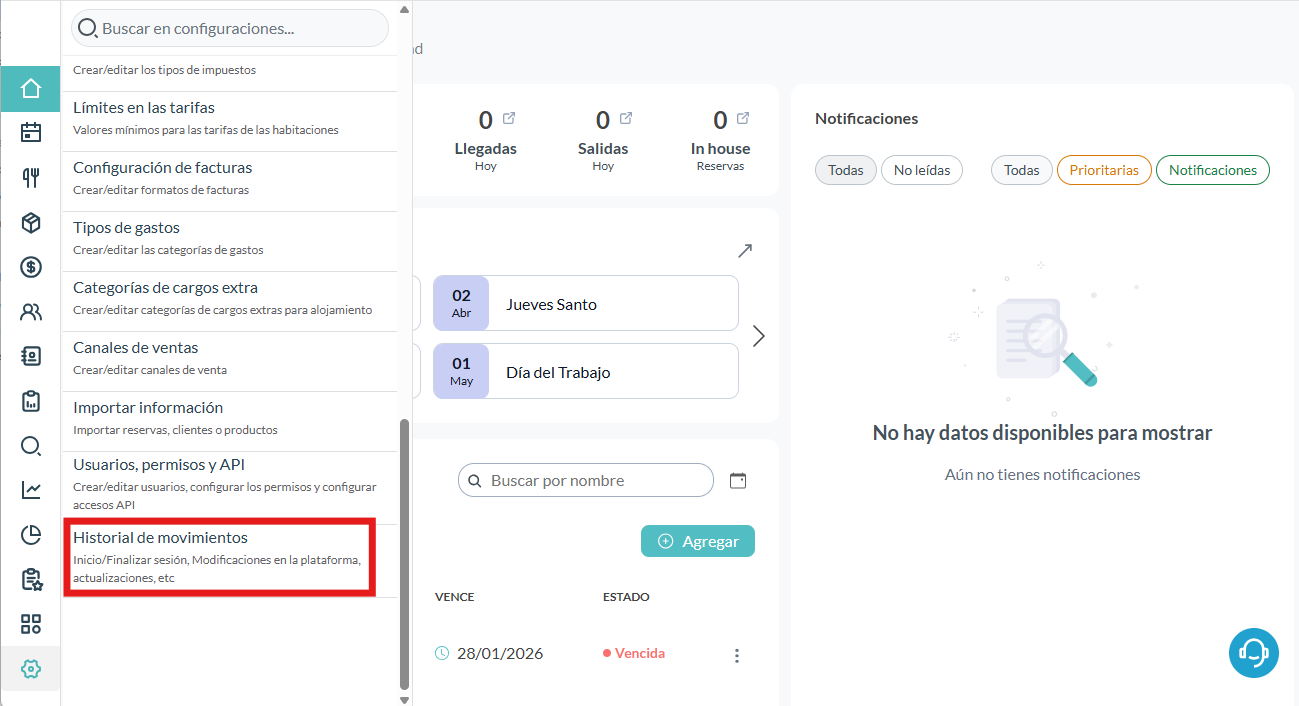 El módulo de Historial de movimientos (Logs) en LobbyPMS permite visualizar todas las acciones realizadas dentro de la plataforma, proporcionando trazabilidad, control y transparencia sobre cada operación ejecutada por los usuarios.