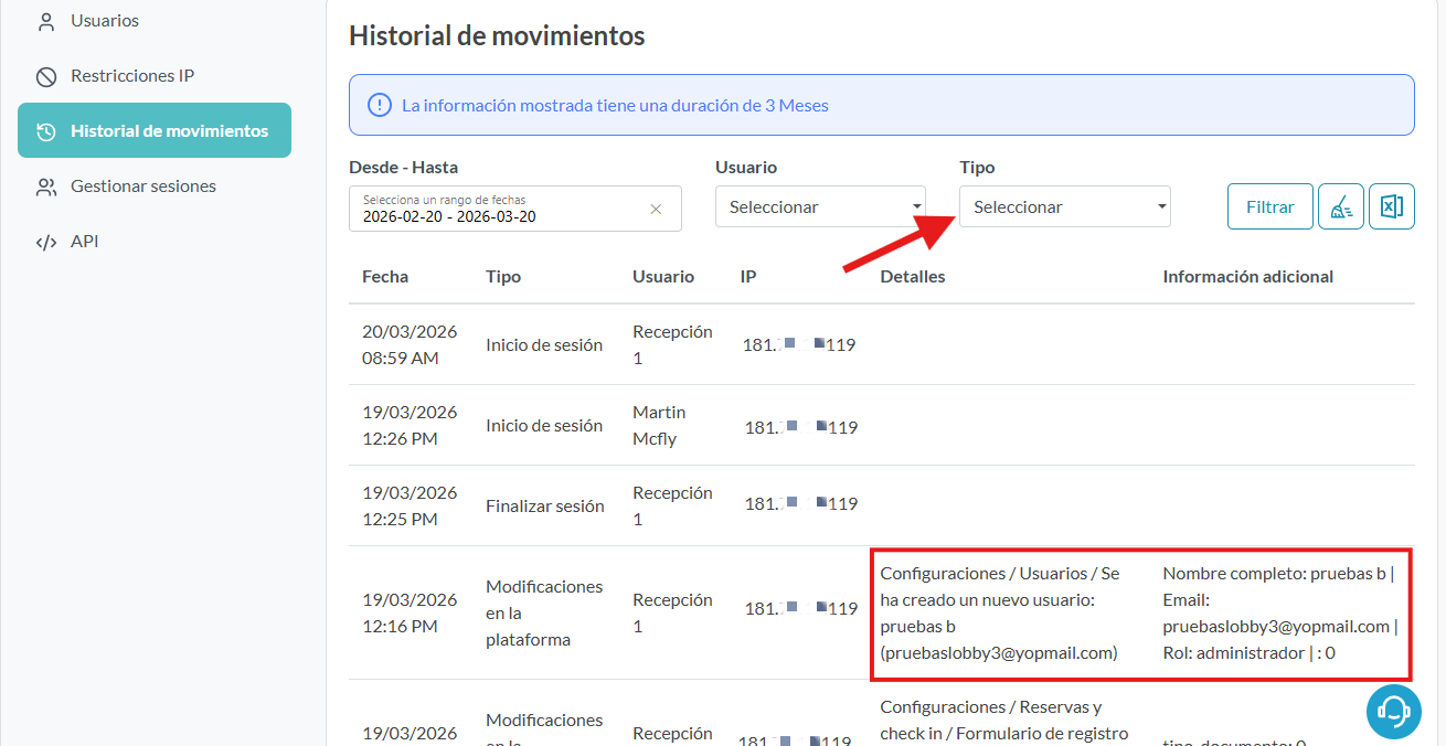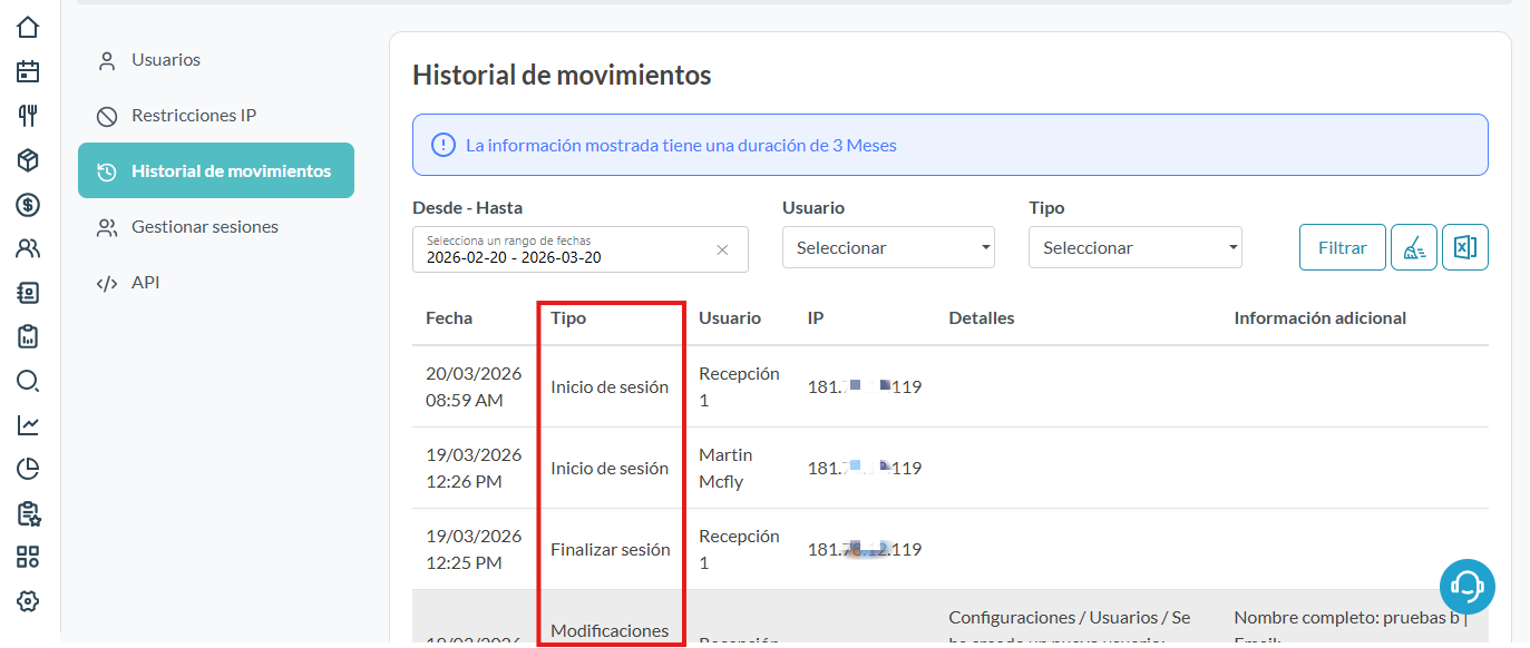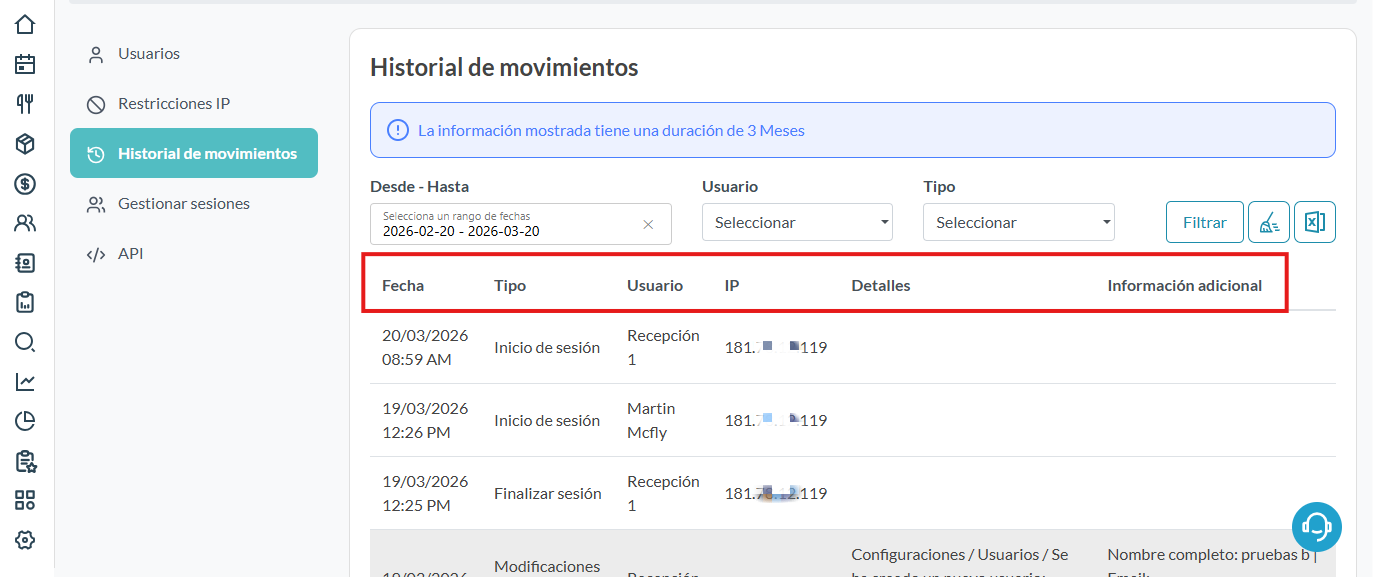 - Información adicional: Campo complementario que proporciona datos extra relacionados con el movimiento registrado, permitiendo ampliar el contexto de la acción cuando aplique.