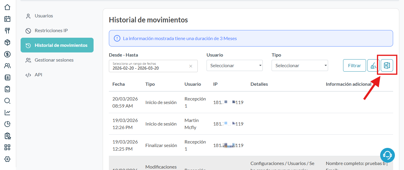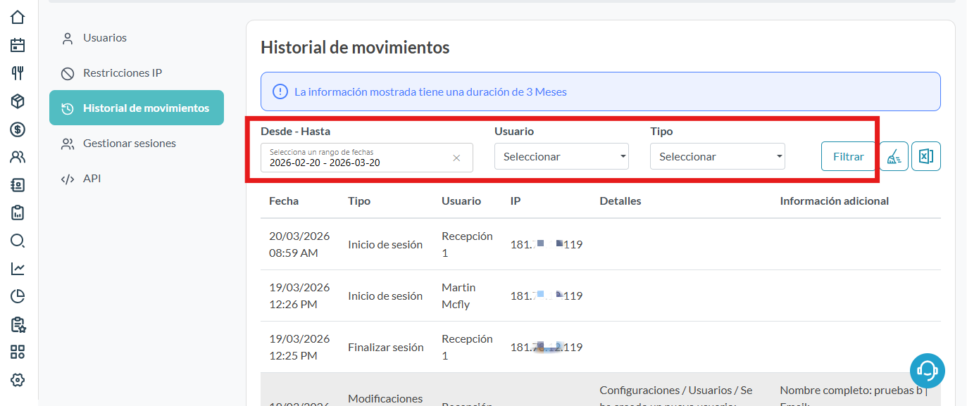 Los logs estarán disponibles en la plataforma por un periodo de 3 meses a partir de la fecha del movimiento.